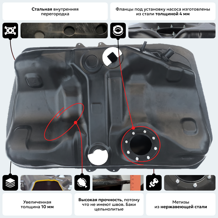 Бак повторяет геометрию оригинального бака и имеет те же габаритные размеры, крепежные и посадочные места. Фланец погружного модуля изготовлен из стали толщиной 4 мм со шпильками крепления погружного модуля М5х25 мм. В баке установлен специальный противоотливной стакан под топливозаборник.